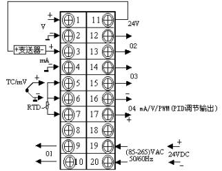 ⑵输入信号为热电阻、远传电阻,必须三线制接入 ⑶特殊要求的仪表,接线方式请以随机接线图为准。