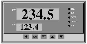 四、操作说明 (一)面板说明 HA-HA报警灯LA-LA报警灯OUT-输出指示灯 COM- 通讯指示灯 AT-自整定状态灯 PV-测量值显示窗 SV-设定值显示窗
